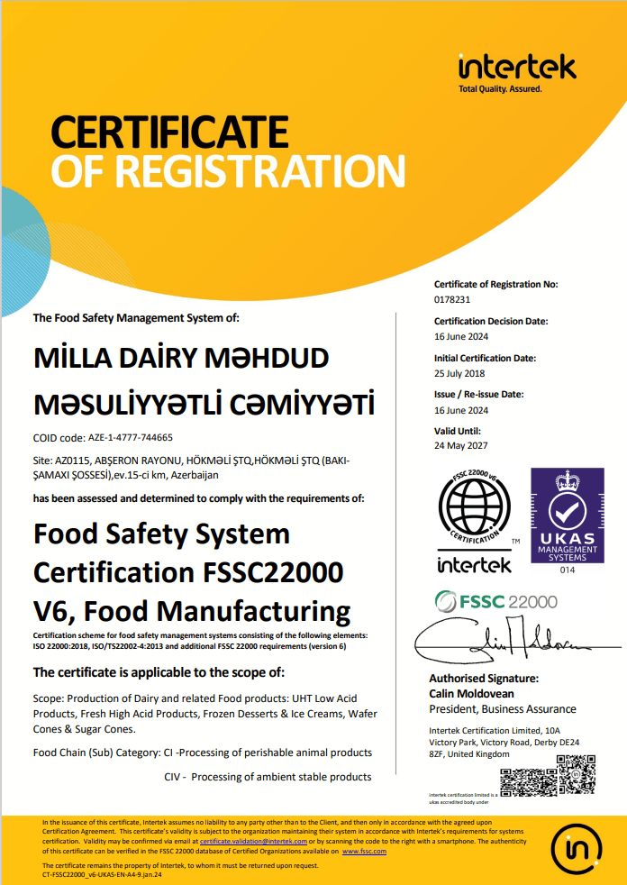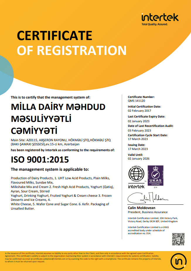 Milla məhsullarının etibarlılığı yüksək standartlara cavab verən daxili laboratoriya testləri, yerli və beynəlxalq sertifikatlar ilə təsdiqlənir. Keyfiyyətimiz yanlız məhsullarda deyil, həmçinin peşəkar işçi heyətində və səmərəli idarəetmə sistemində özünü göstərir. Azərbaycan Standartlaşdırma İnstitutu ilə sıx əməkdaşlıq, daxili təhlil və təlimlər vasitəsiylə sistemin davamlılığını təmin olunur.